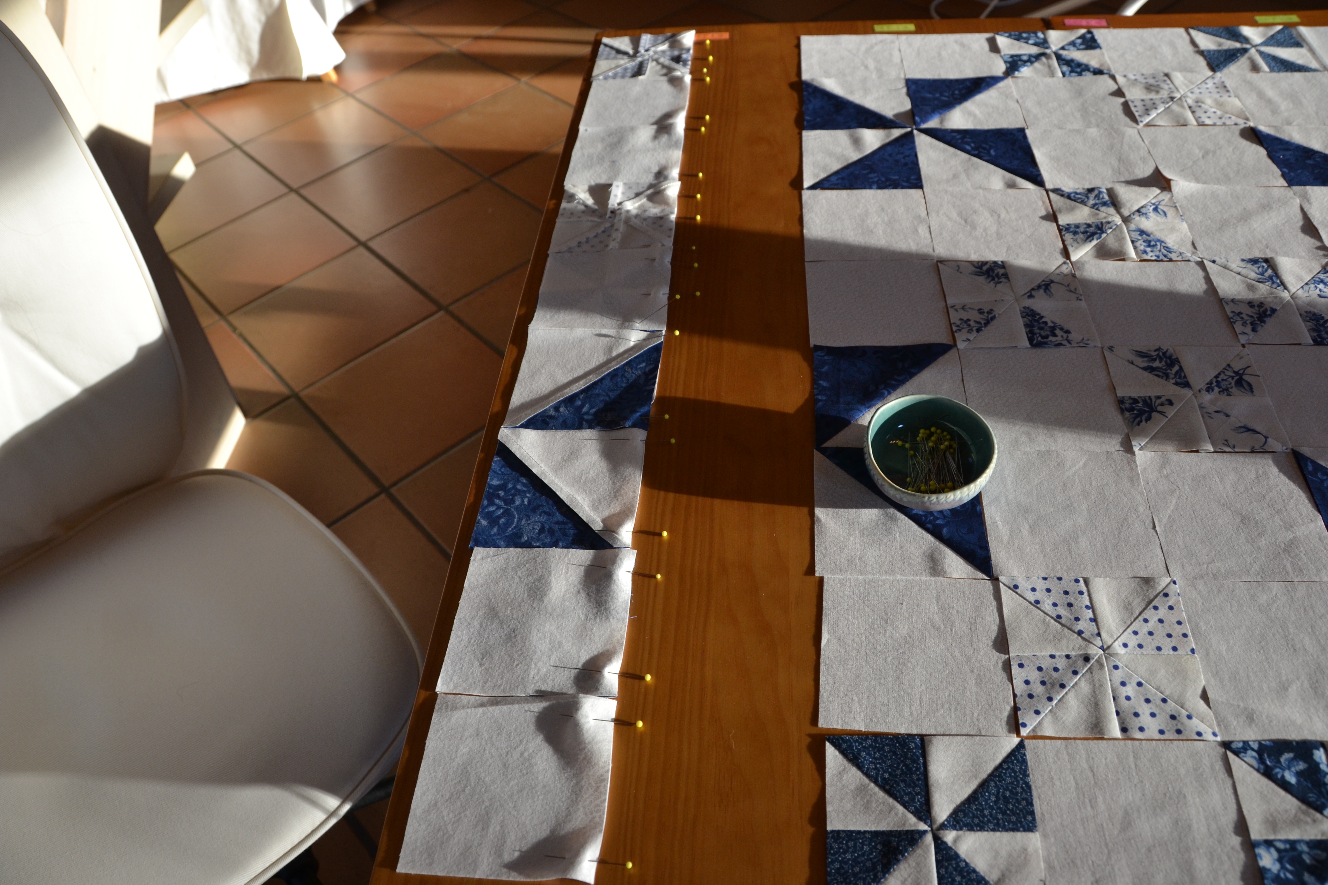 So this is where I will be stationed until the top is all sewn together. That probably means we’ll be eating on our laptop tables for a few more nights.