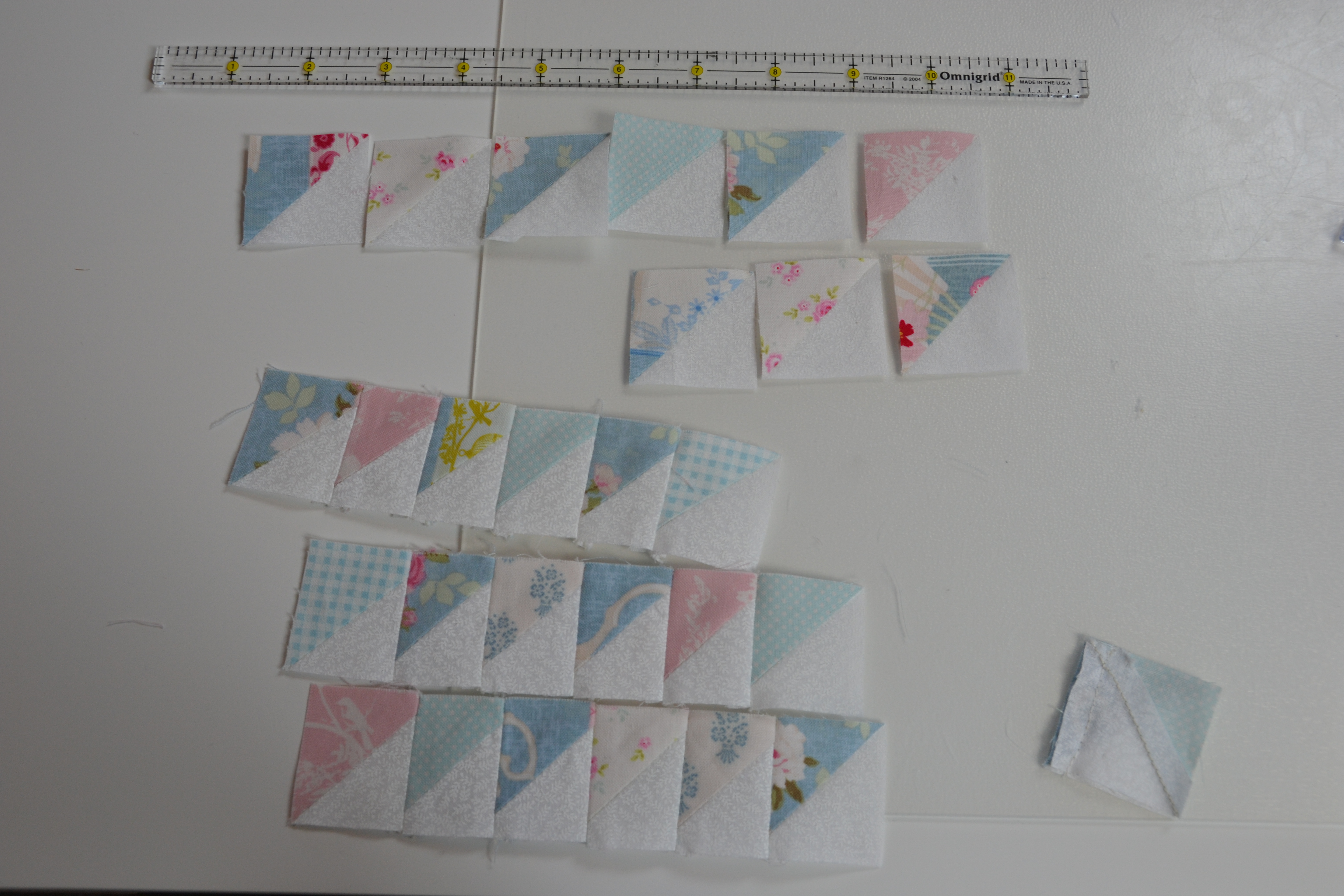 Unfortunately, I’ve really been having trouble, (as I did with quilt itself) sewing these tiny HST’s together. Not only do I have a major tension problem which I can’t seem to fix but the beginning of the material gets eaten by the machine and I can’t seem to keep the seam straight, which tends to veer off at the end despite having marked a seam line. I am trying to research my issues but if anyone has any pointers I would certainly appreciate them.
