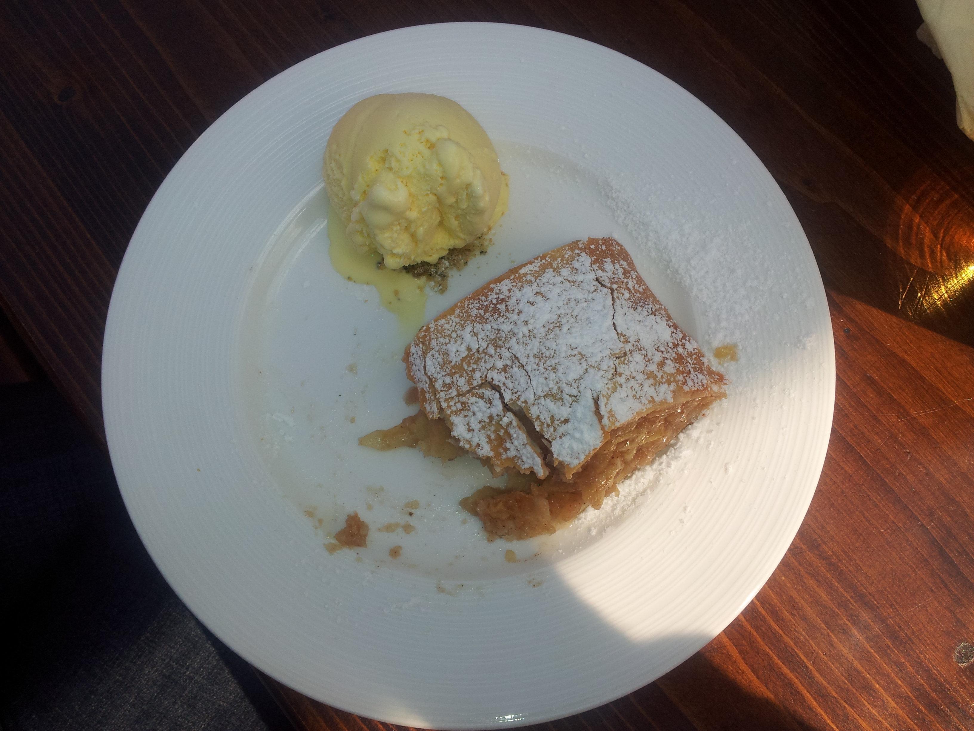 I of course opted for the most typically Austrian dessert of all: Fresh Apple Strudel accompanied by delicious vanilla ice cream on a bed of what we think was pistachios. Whatever it was, was divine. This one didn’t have too many raisins, which I don’t really appreciate in Apple Strudel, which was lovely and had a lovely noticeable note of cinnamon, which I loved.