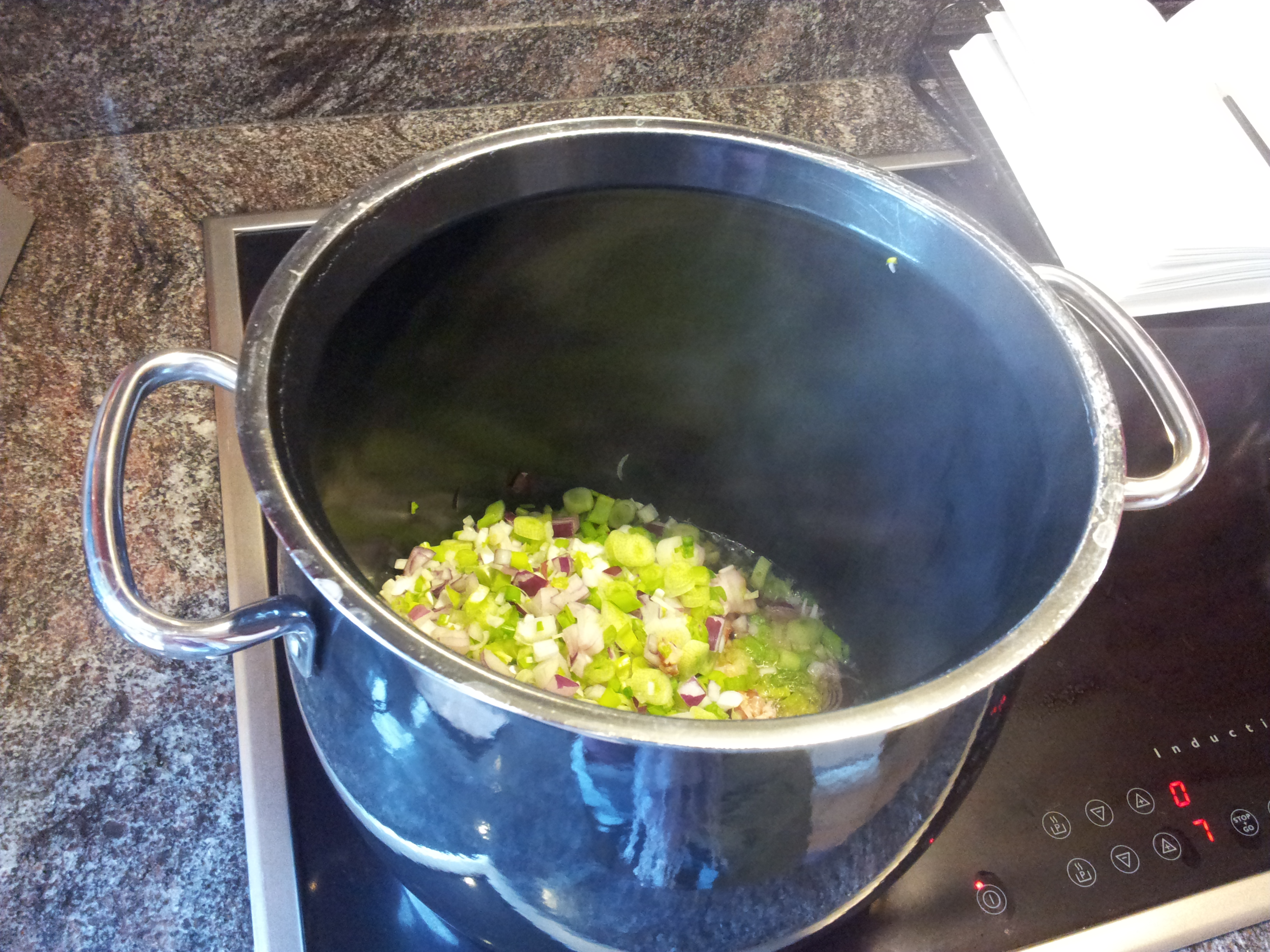 So replacing the celery and leaks with green (spring) onions (hubby doesn’t like celery), I sliced them up, fresh greens and all, and threw them in the pot together with the chopped up red onions.