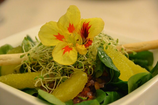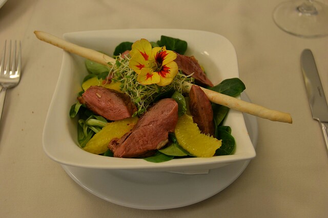 I had this delicious filed salad with orange sectors and pomegranate and a very tangy dressing and Yves had the same but with the balsamic glazed duck, which was in the original offer,