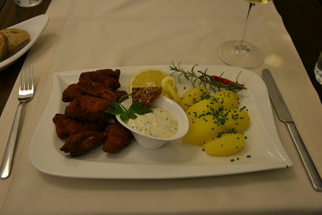 Although they had a lot of yummy things like Pizokel dumplings with some exotic twist and Pork filet rapped in bacon and served with fresh Spätzli, and delicious sounding burgers and all sorts of other things, I went for the fried fish and salt potatoes, which is traditional for the area, also known as Fischknüsperli.  Sorry, but with the weather as damp and cold as it had been, I had been feeling a little yuck and so needed something simple, so unfortunately cannot see any of those other lovely things.