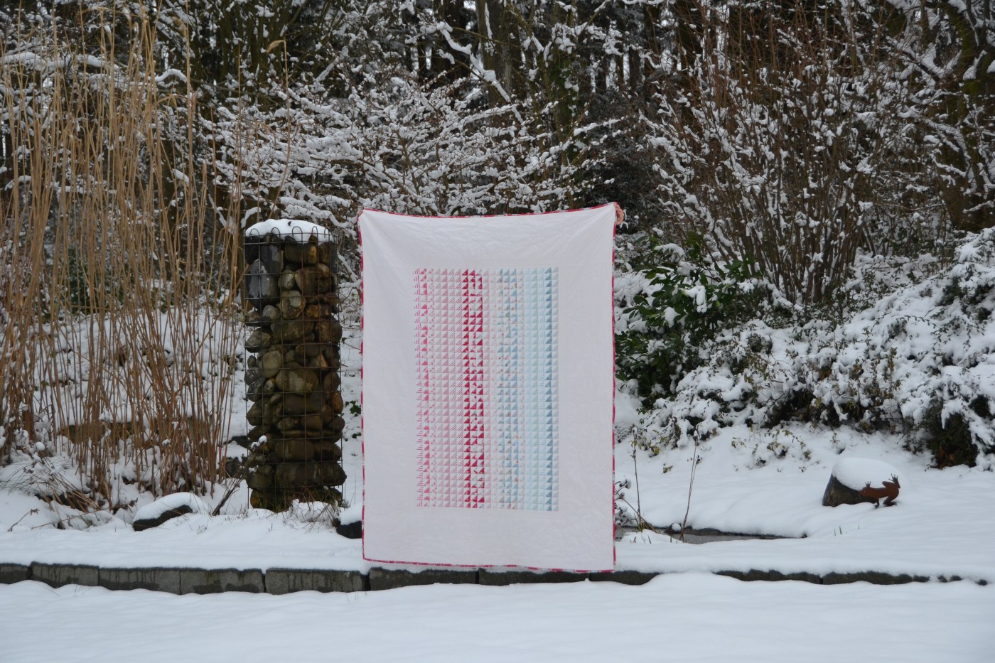 Well it has been many many months, but I am finally able to reveal what I am calling my ‘Red Currant Quilt’. I finished it January 2nd but have been waiting until we got some nice weather for a photo shoot. Eventually, I was forced to give in and just take it in the garden by our pond.