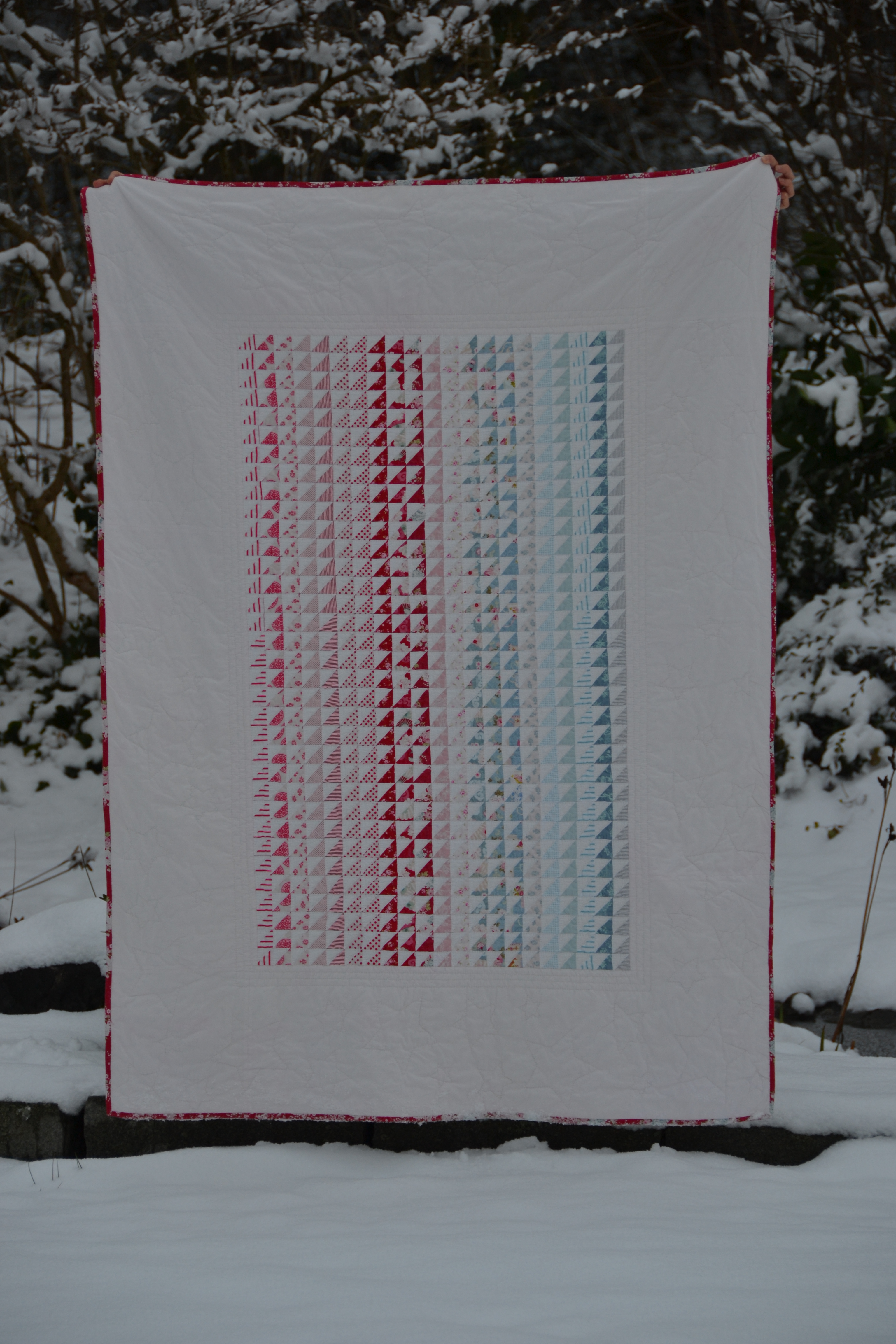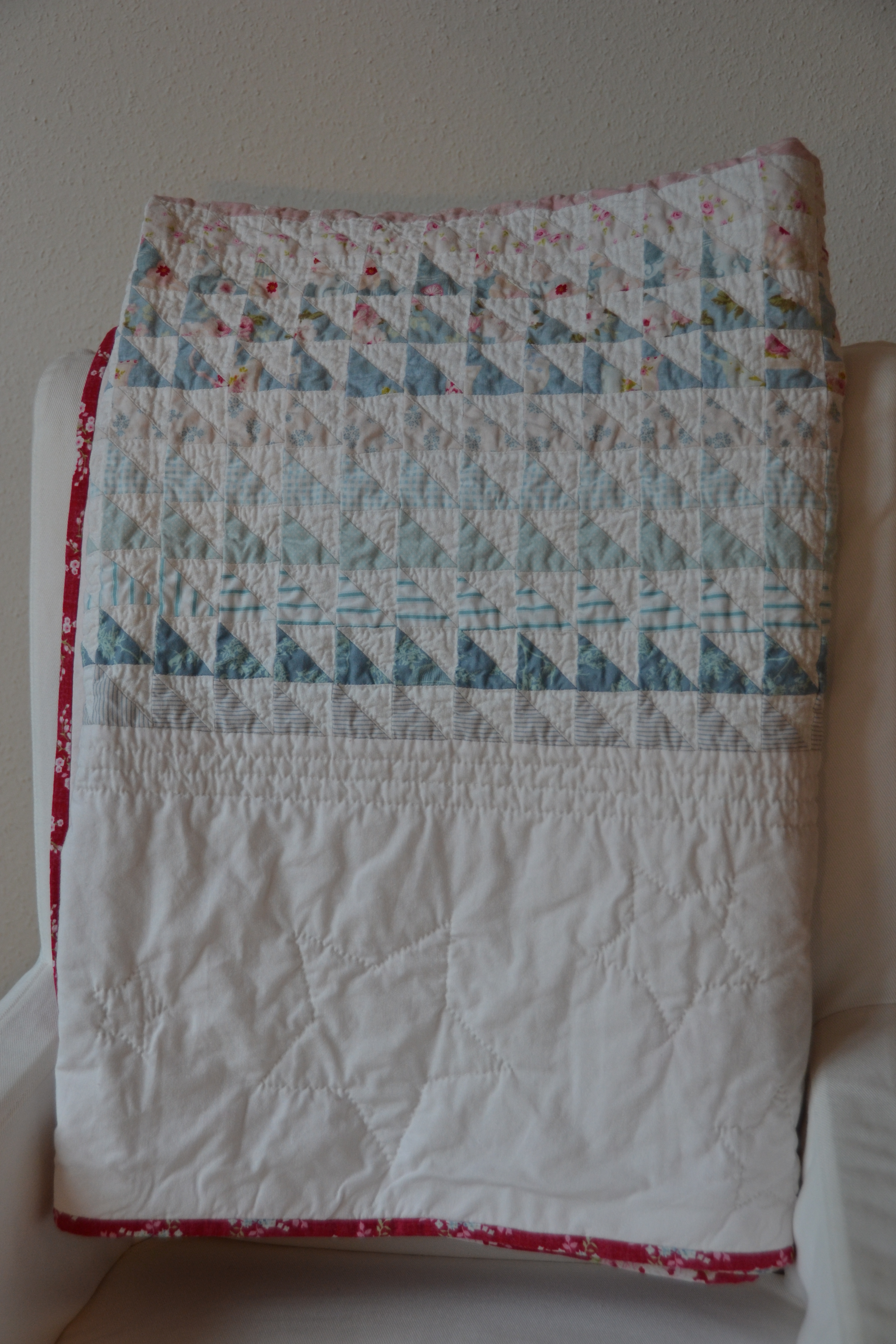 My favorite part of the process of making this quilt was hand quilting it. It took a long time, but it brought me so much pleasure. I simply outlined each white triangle.