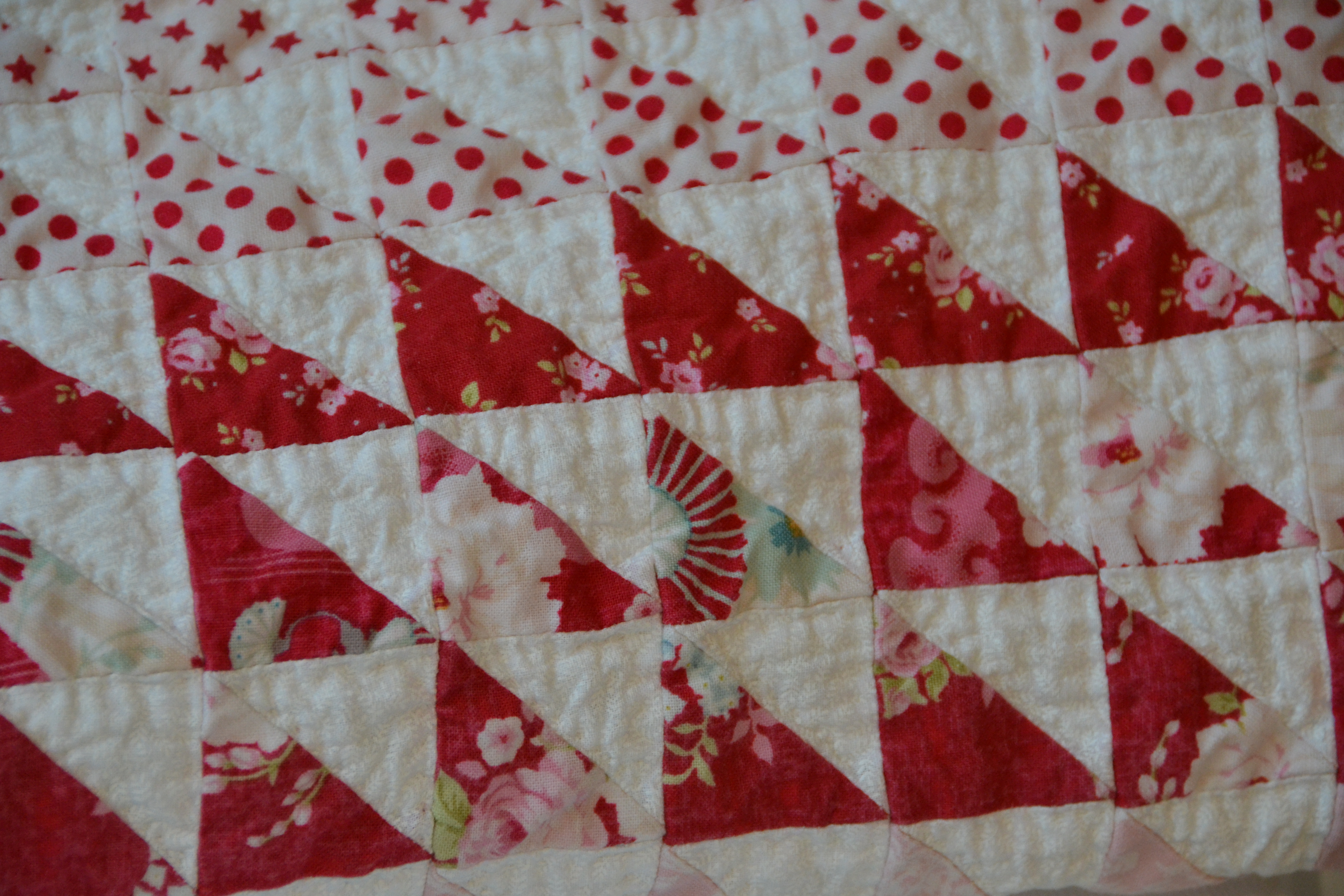 Unfortunately, when I washed my quilt this lovely red fabric ran. For some reason it only ran into the border, as that was a different fabric than the half-square triangles. But what was I to do, I used pre-cuts and color catchers?