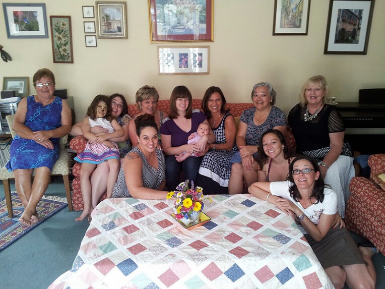 My first quilt was a child’s bed quilt made with lots of love, for my niece Stephanie, seen far left with a tiger face painted on her. (Also to be seen is my mother’s side of the family, cousins and aunties and mini cousins) My mom is the one in the blue at the far left.