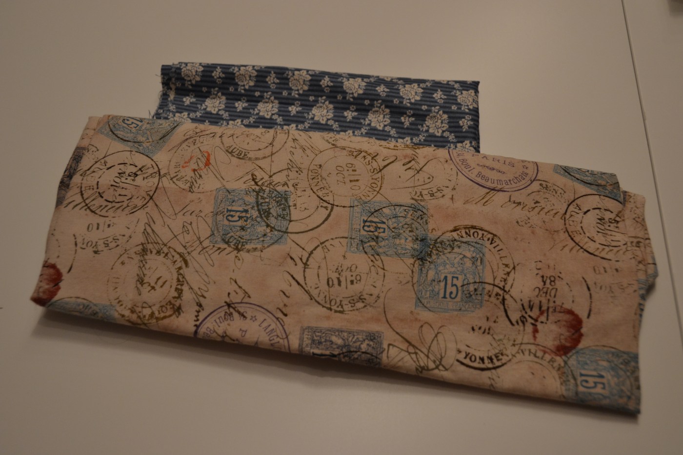 I should start in an organized fashion with the feature fabric first, the beige fabric. It is this beautiful nostalgic design by Tim Holtz for Coats. It’s from the line Eclectic Elements and is called #PWTH 021 Correspondence.