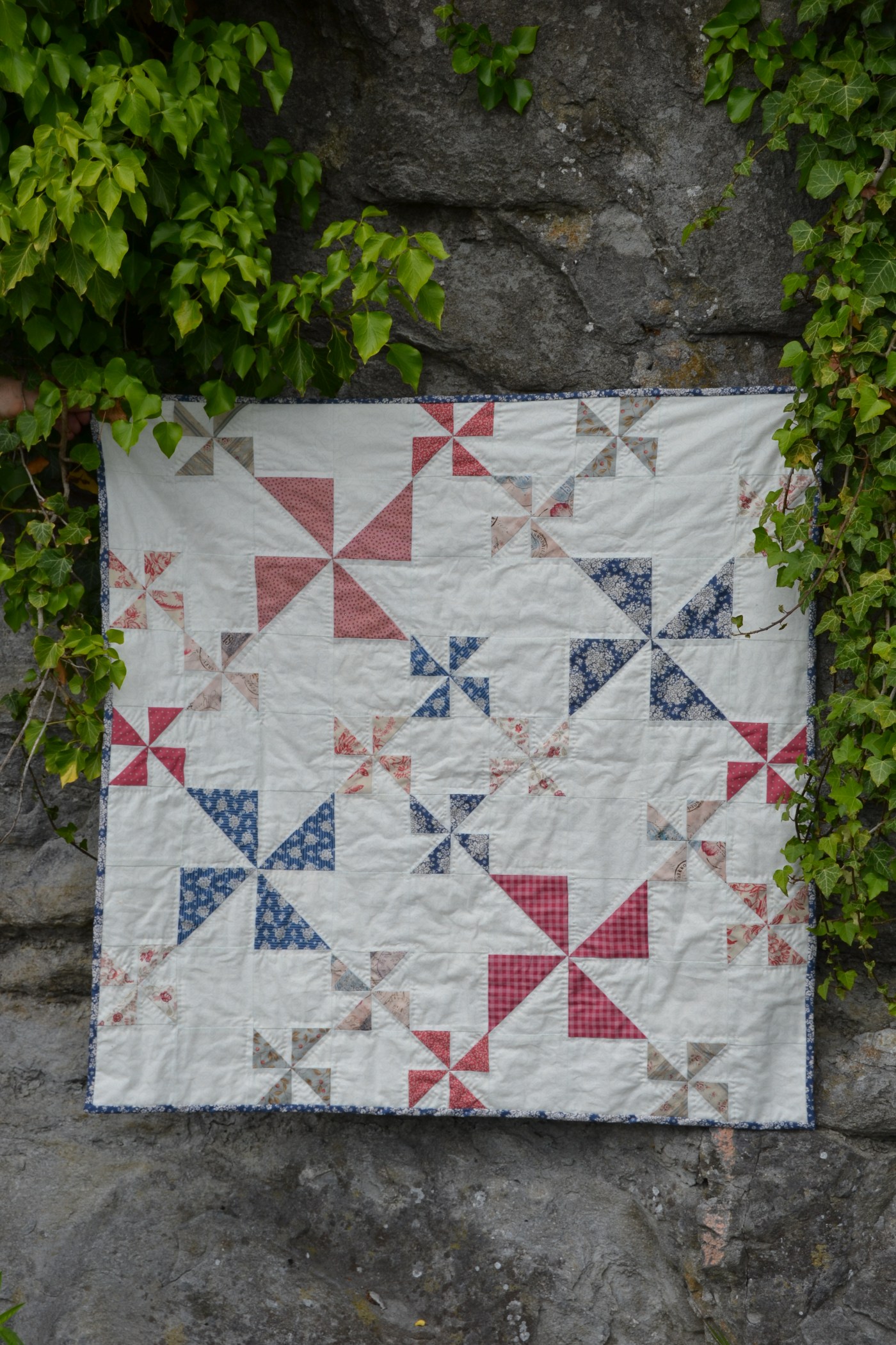 As I gave that blue and white version to my mother, I didn’t think it to wrong to make a second version of this quilt. After all I love pinwheels and I just haven’t found a better, free pattern since discovering it. The size is perfect if you want a quick project. At 35.5 X 35. 5 inches it makes a great baby quilt or a wall hanging. Mine will be hung on the wall.