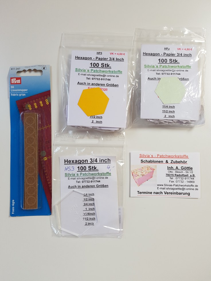 I also bought a plastic hexie template for the fabric and anti-slip stickies for the template. For access to this shop’s website please see the business card.
